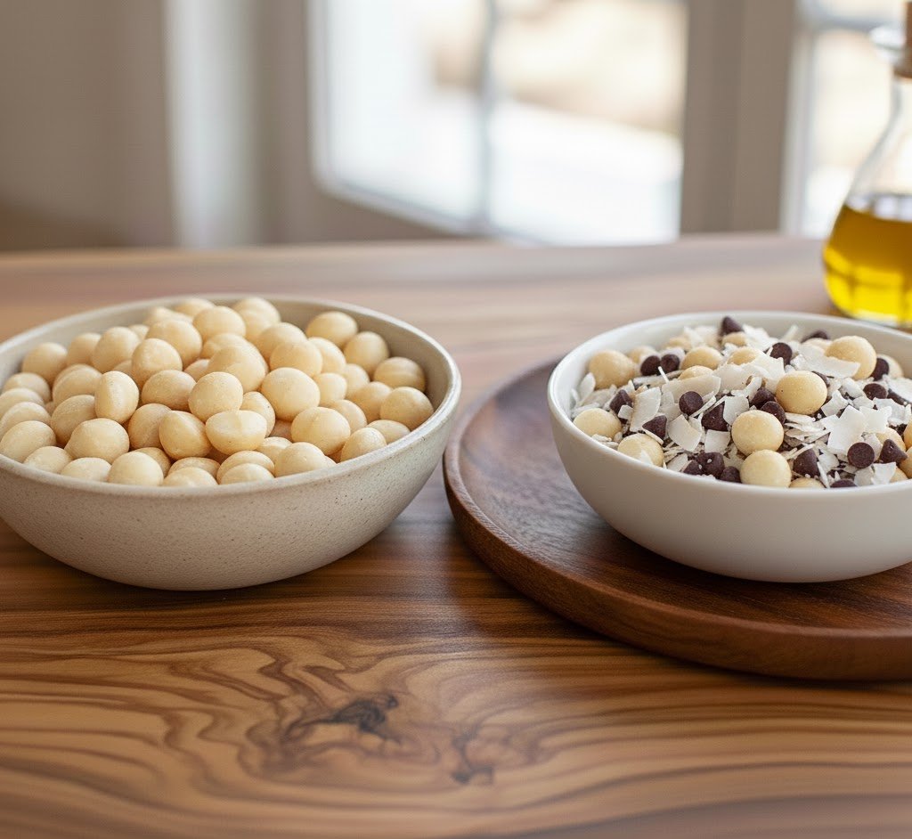 Mix dulce saludable: Mezcla 2 oz de nueces de macadamia con coco rallado y chips de chocolate oscuro.
