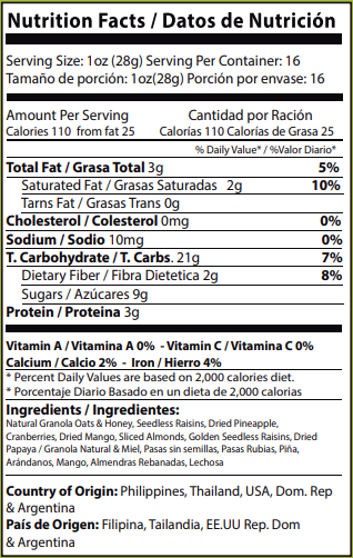 Nuestra granola con frutas contiene avena tostada, pasas, almendras, arándanos y más. Ideal para desayunos saludables, combinar con yogur o leche. Alta en fibra, sin azúcares refinados.