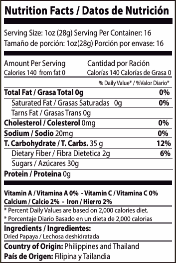 La lechosa en trozos es una fruta tropical deshidratada naturalmente, con un sabor dulce y suave. Rica en fibra y antioxidantes, es perfecta para snacks saludables o para añadir a cereales y mezclas de frutas.