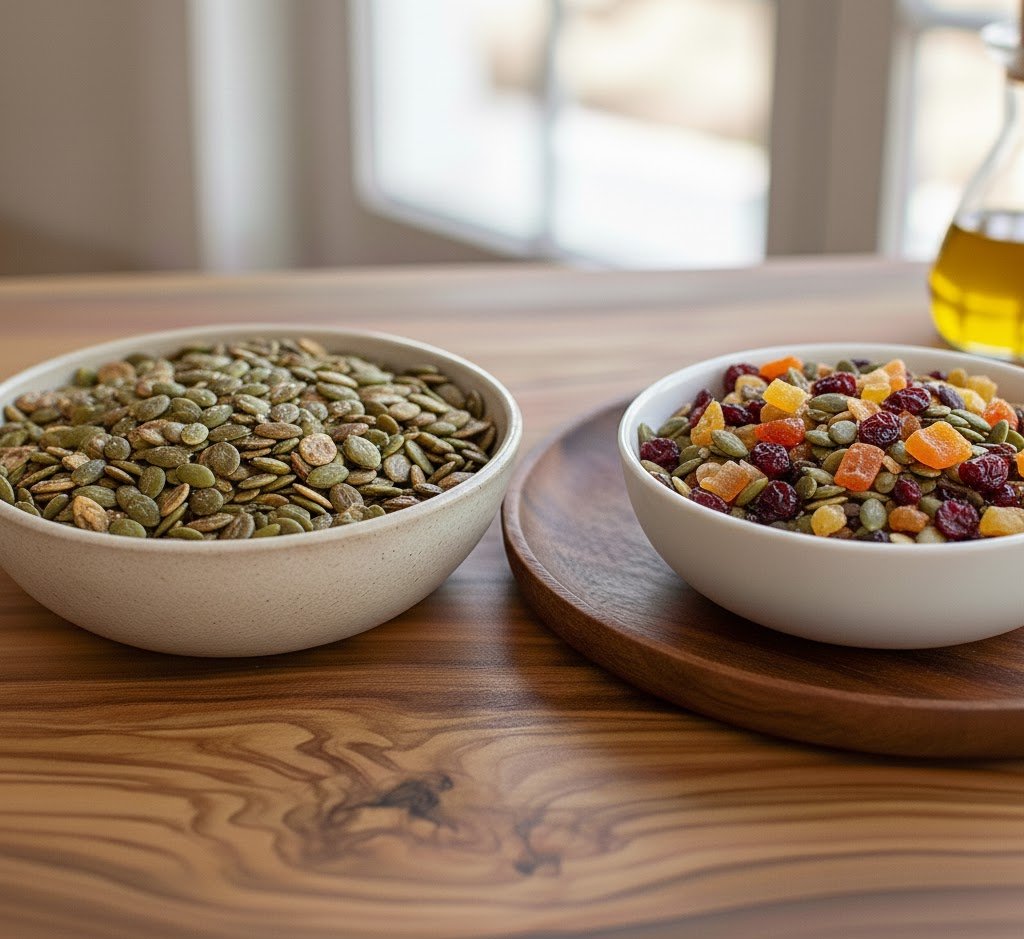 Snack crocante: Sirve 2 oz de semillas de auyama tostadas con trozos de fruta deshidratada.