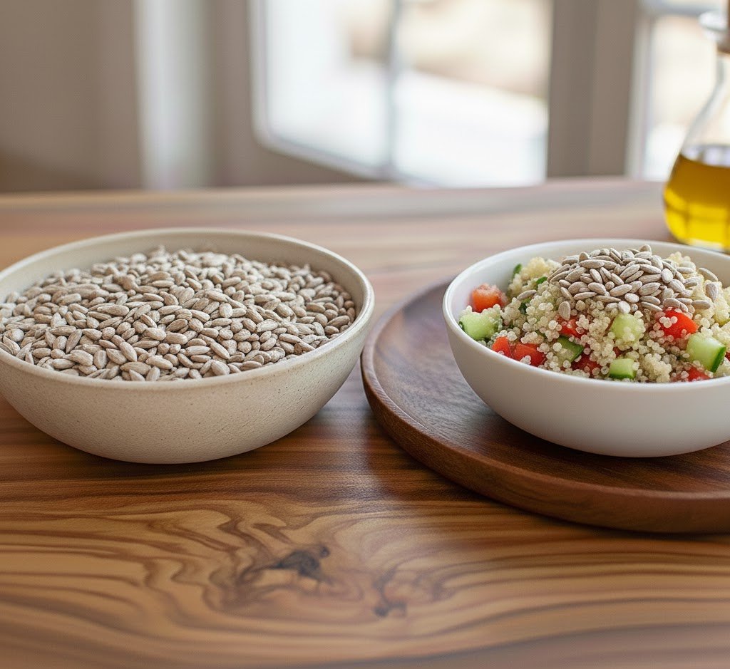 Ensalada de quinoa con semillas: Mezcla quinoa cocida, vegetales y 2 oz de semillas de girasol.